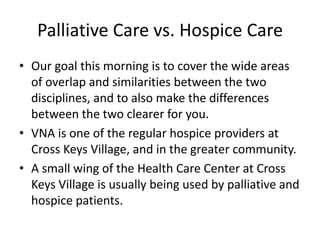 Palliative care is for people with a serious illness. This resource is part of the Hospice Benefit. While hospice provides end-of-life care usually when the patient has 6.